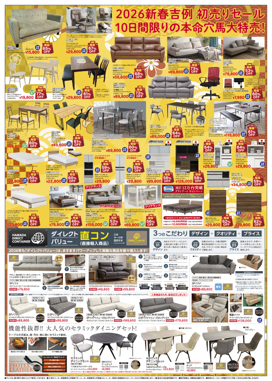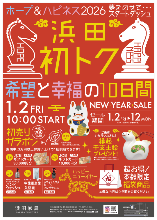 2025.12.27 2026年 明けましておめでとうございます。 新年あけましておめでとうございます🎍 旧年中は浜田家具をご愛顧いただき誠にありがとうございました。 浜田家具では1月2日㈮より『初トク 希望と幸福の10日間』と題しまして初売りを行います。 選りすぐりの商品に加えて初売りガラポン(先着200名様)やご来店の方に縁起干支土鈴をご用意しております。 ガラポン1等JCBギフトカードなどお得がいっぱい✨ 浜田家具の初売りへ是非お出掛けください。 スタッフ一同心よりお待ちしております!